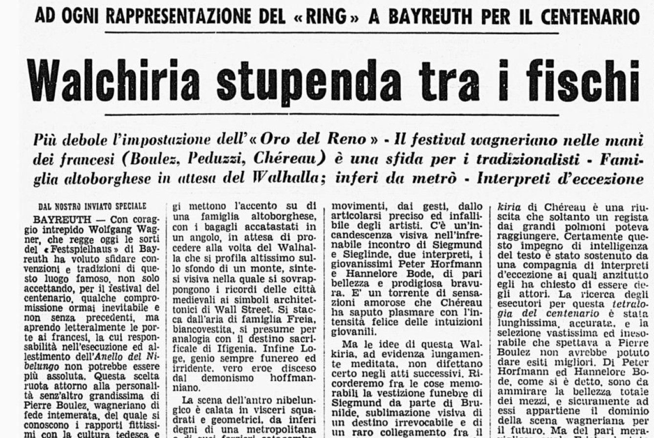 Déjà en 1972, Wolfgang Wagner, frère de Wieland et neveu de Richard, avait demandé à Pierre Boulez de diriger le Ring à Bayreuth à l'occasion du centenaire de la première représentation. C'est à lui qu'il revenait de choisir le metteur en scène ; en janvier 1974, après avoir essuyé les refus d'Ingmar Bergman, Peter Brook et Peter Stein, le directeur s'adressa – sans le connaître, mais sur recommandation de Michel Guy, l'inventeur du Festival d'Automne – à Patrice Chéreau, issu du monde de la peinture et dont la carrière fulgurante comptait très peu de productions de théâtre musical à son actif (il n'en aura en tout que 14, contre 23 pour Visconti et 85 pour Ronconi) ; la première, vue et appréciée par Visconti lui-même, avait été L'Italienne à Alger de Rossini, dirigée par Thomas Schippers, au Festival de Spoleto de 1969, passé à l'histoire pour l'Orlando de Ronconi.