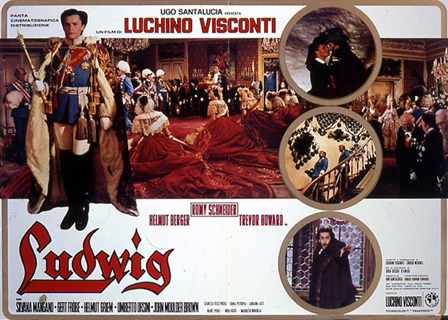 Il Ludwig di Visconti – tessuto di temi wagneriani, non solo nella colonna sonora, eseguita dall’orchestra di Santa Cecilia, diretta da Franco Mannino, cognato del regista – è girato, in gran parte, nei luoghi abitati o fatti costruire dallo stesso Ludwig; le riprese cominciano il 31 gennaio 1972 e sono concluse il 24 giugno. Il 27 luglio, a Roma, Visconti è colpito da un ictus; trasportato a Zurigo, è curato nell’ospedale cantonale (quello dove è morto Thomas Mann). Ristabilito, per quanto semiparalizzato, monta il film nella villa di famiglia a Cernobbio, dando vita a una pellicola molto lunga e per cui non escludeva una proiezione in due parti. La produzione italo-franco-tedesca procede a drastici tagli e il film è presentato, in prima mondiale, a Bonn il 18 gennaio 1973; solo nel 1980 la pietas di alcuni amici del regista porta a una ricostruzione del supposto originale, che ne ristabilisce la durata wagneriana, pur eliminando l’alterazione della sequenza cronologica degli eventi prevista da Visconti e quindi la magia dei presagi.