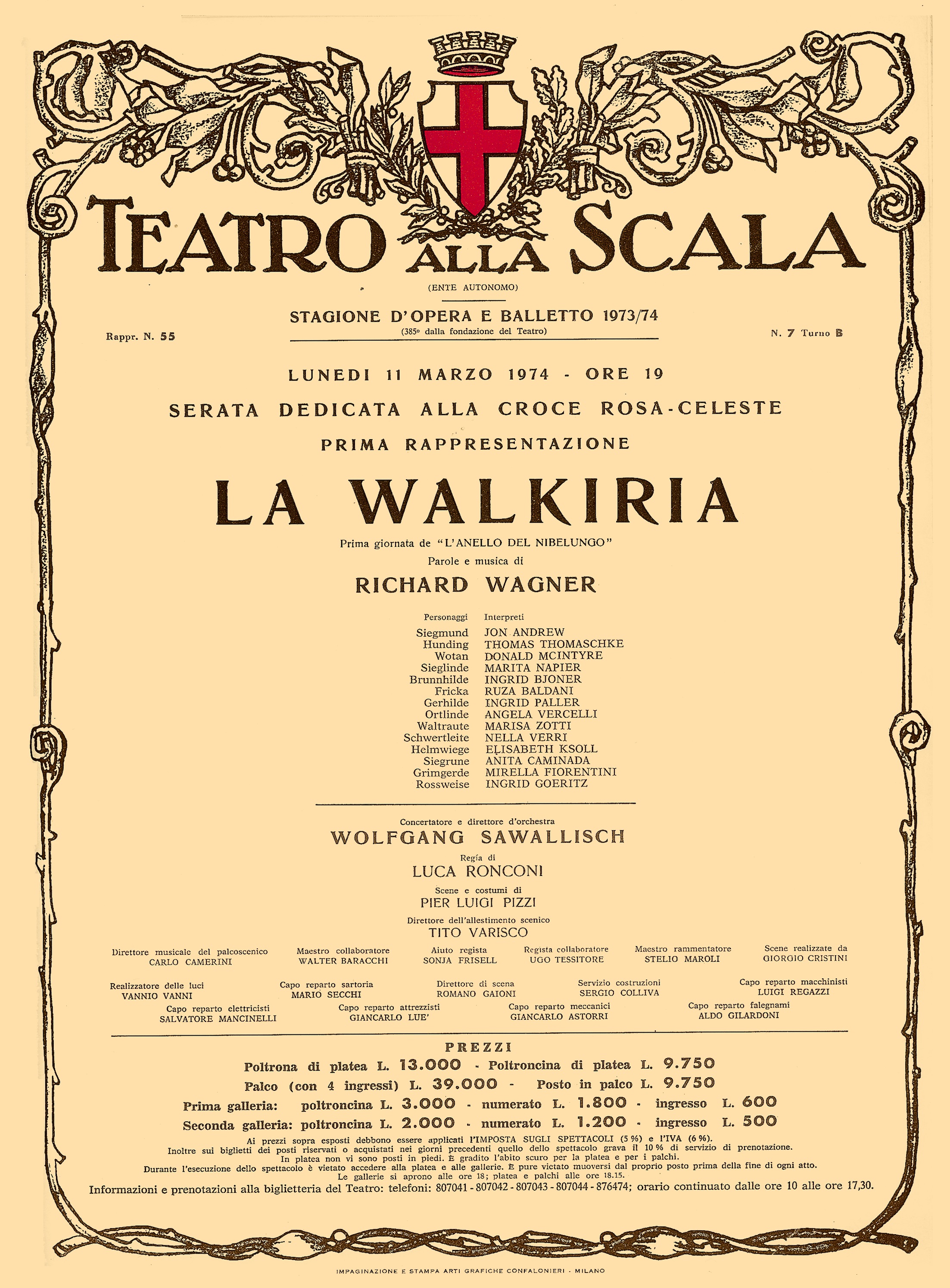 La Walkiria milanese di Ronconi e di Pizzi, impegnato alla Scala fin dal 1962 (con Il Trovatore di Giorgio De Lullo, diretto da Gianandrea Gavazzeni), rappresenta un’innovazione cruciale, non compresa né approvata da Sawallisch: è una lettura critica storicizzante, a multipli strati, scenicamente imprevedibile, dove la prima giornata del Ring diventa la storia privata e intima, spogliata dall’enfasi e dagli spazi aperti della natura, di una famiglia e di una società. In un monumentale salone tardottocentesco, ricco di specchi e di tendaggi, dove rivivono, come in un museo, persino le macchine sceniche del passato tardoromantico (la cremagliera per la cavalcata delle Walkirie, per esempio), Wagner prende qualche cadenza da dramma borghese, mentre Fricka assume addirittura qualche tratto di Cosima Wagner.
