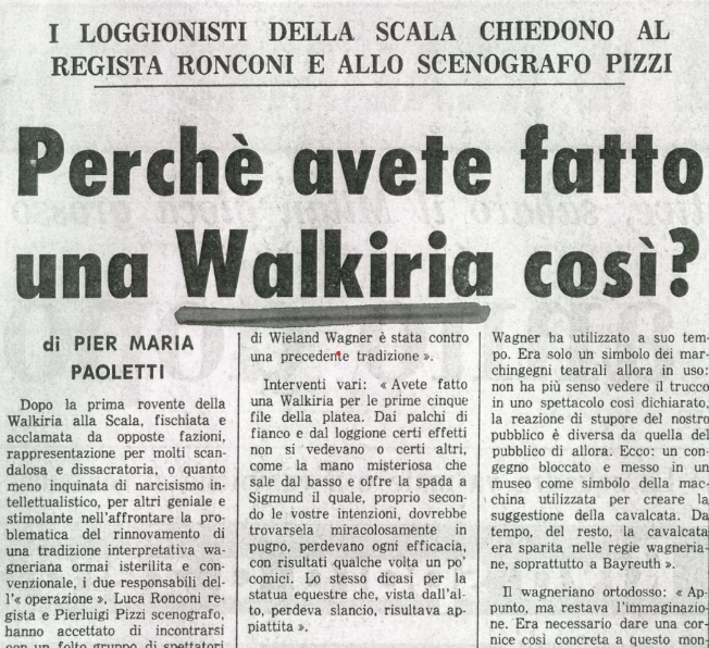 Alla prima, l’11 marzo 1974, scoppia una bagarre in sala, destinata a trascinarsi, la notte, sulla piazza antistante il teatro e a dilagare quindi sui giornali. Non mancano i sostenitori del regista e dello scenografo, tra cui Lorenzo Arruga, Duilio Courir (che considera la Walkiria di Ronconi paragonabile solo alla Manon di Visconti, vista quell’anno a Spoleto), Fedele d’Amico e Mario Messinis; il più entusiasta è Giovanni Testori.