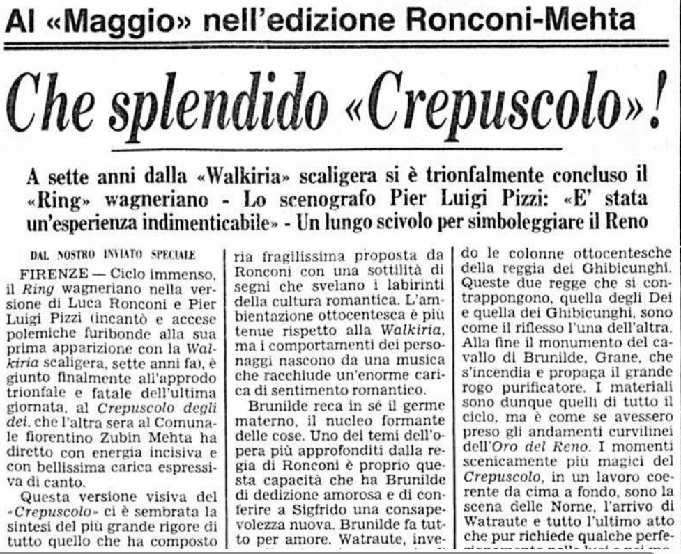 Dal 1977, con il Don Giovanni di Mozart al Regio di Torino, Pizzi ha saltato il fosso e si è fatto regista; Ronconi, dimessosi dalla Biennale di Venezia, ha alle spalle l’esperienza – a fianco di Gae Aulenti, conosciuta nei camerini della Walkiria scaligera – del Laboratorio di Progettazione Teatrale a Prato (1976-1979). A quegli spettacoli mitici, in particolare alle Baccanti di Euripide, sembrano rimandare i mattoni del Nibelheim o il letto di ferro nell’antro di Mime. Il Ring fiorentino rischia così di essere un esito impeccabile di una stagione precedente; Ronconi e Pizzi si ritroveranno ancora, e sarà l’ultima volta, a celebrare, con Europa riconosciuta di Salieri, diretta da Muti, nel 2004, la conclusione del restauro del Teatro alla Scala. E non mancheranno i cipressi di Böcklin, il pittore che Wagner avrebbe voluto a Bayreuth.